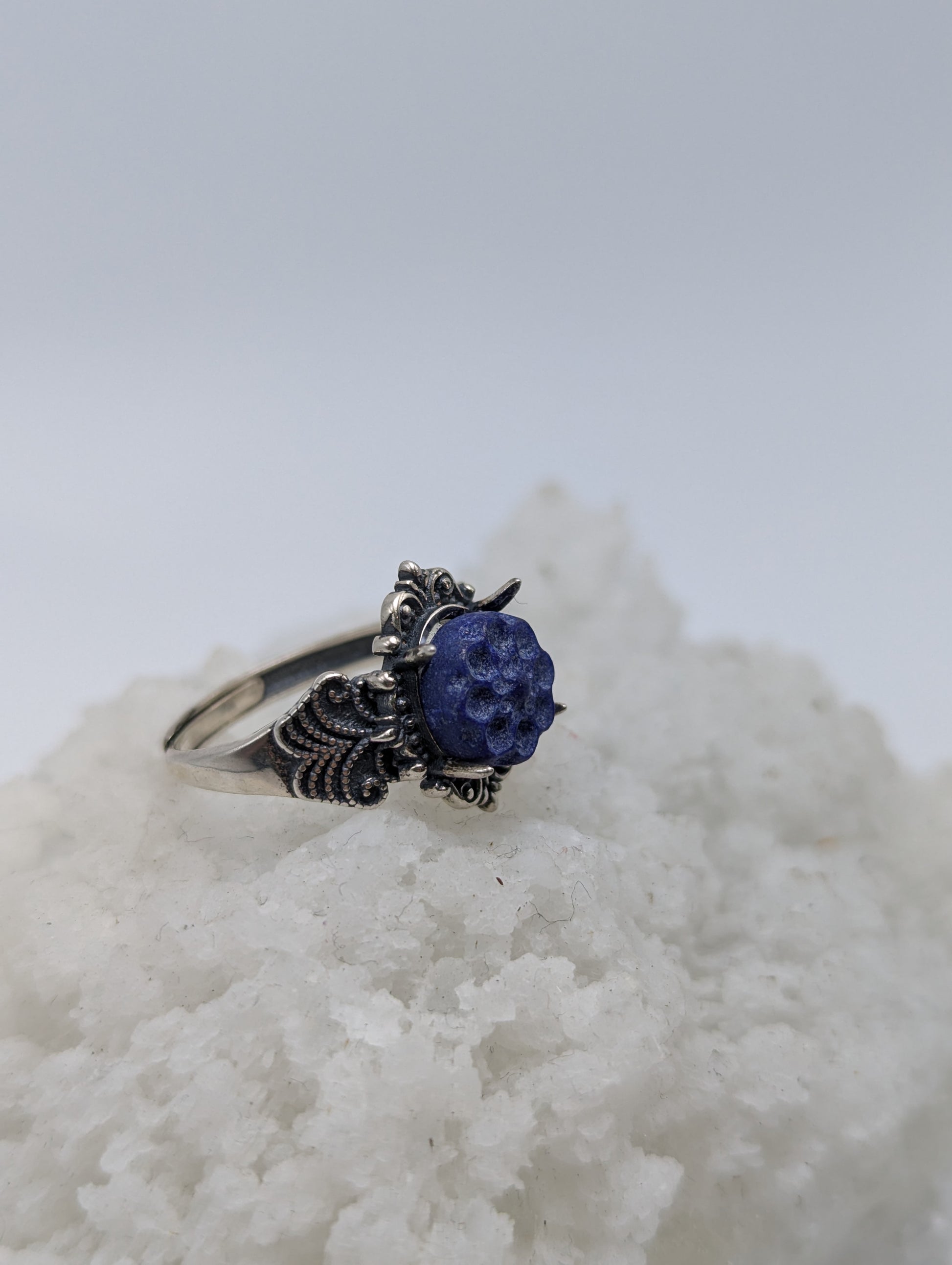 This 925 sterling silver ring boasts an antique style and features a stunning lapis lazuli rose carved stone. With its unique design and high-quality materials, this ring is sure to make a statement and elevate any outfit. Expertly crafted, it is a timeless addition to any jewelry collection.
